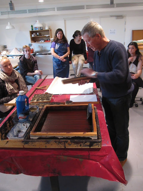 Clara's morfar var så elskværdig at komme forbi studiet, for at vise os (og lade os prøve) blåtryk. Blåtryk er i fare for at være en uddøende teknik, og det er virkelig trist, for håndværket appelere i høj grad til min æstetiske sans. Her er kun vist en billedserie af Heinz der demonstrere hvordan man trykker, men inden da ligger et kæmpe forarbejde, hvor messing formes, forarbejdes og bankes præcist på plads i en træplade, for at give de unikke mønstre liv.